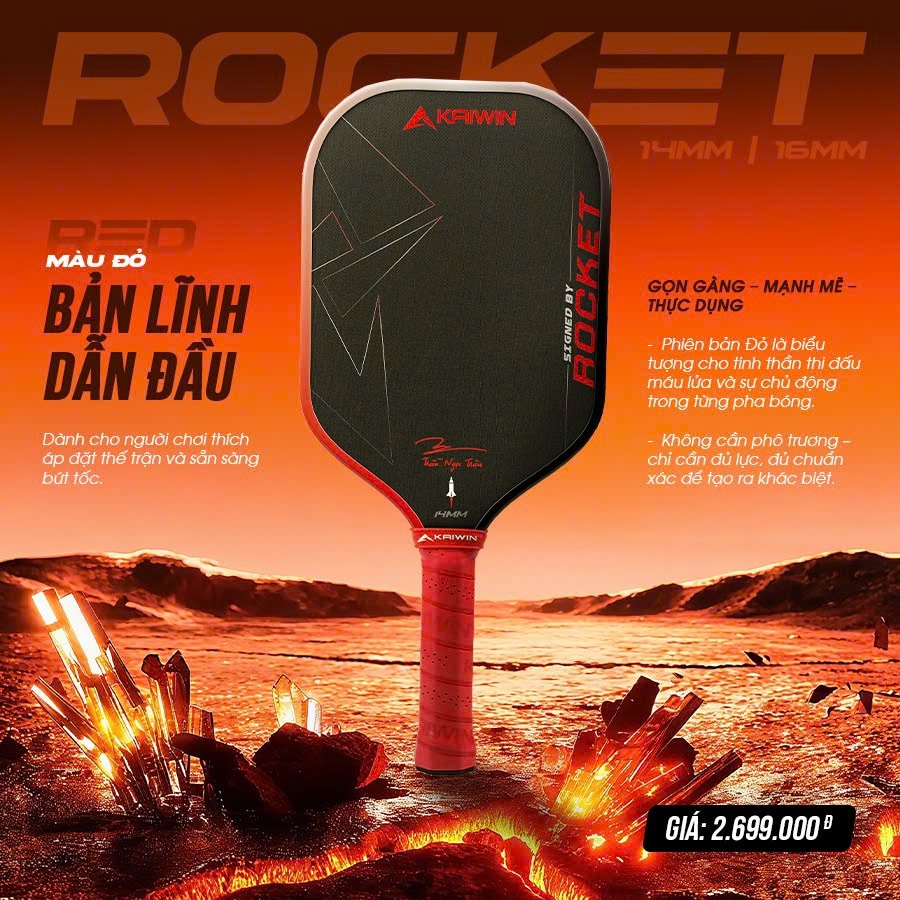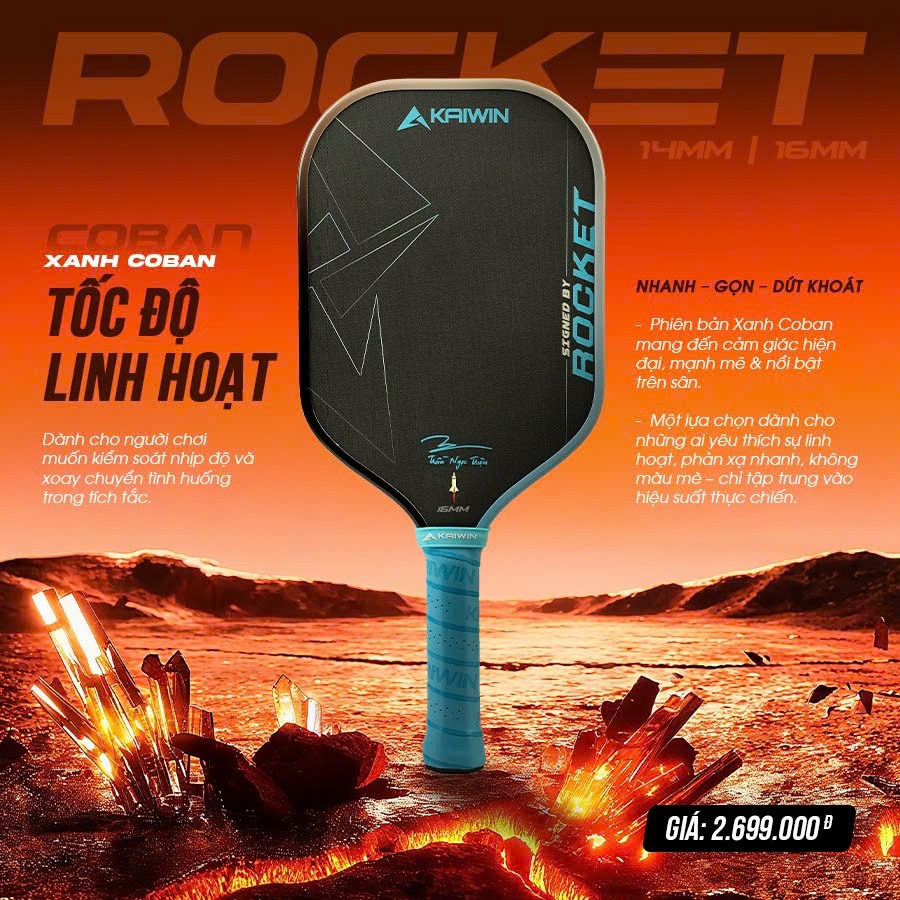– Vợt Pickleball Kaiwin Rocket là phiên bản được Triệu Cầu Lông trực tiếp lựa chọn và tinh chỉnh, tập trung tối đa vào hiệu suất thi đấu thực tế. Tổng thể thiết kế theo phong cách gọn gàng, mạnh mẽ và đề cao tính ứng dụng, không cầu kỳ nhưng vẫn toát lên sự tự tin và bản lĩnh trên sân.