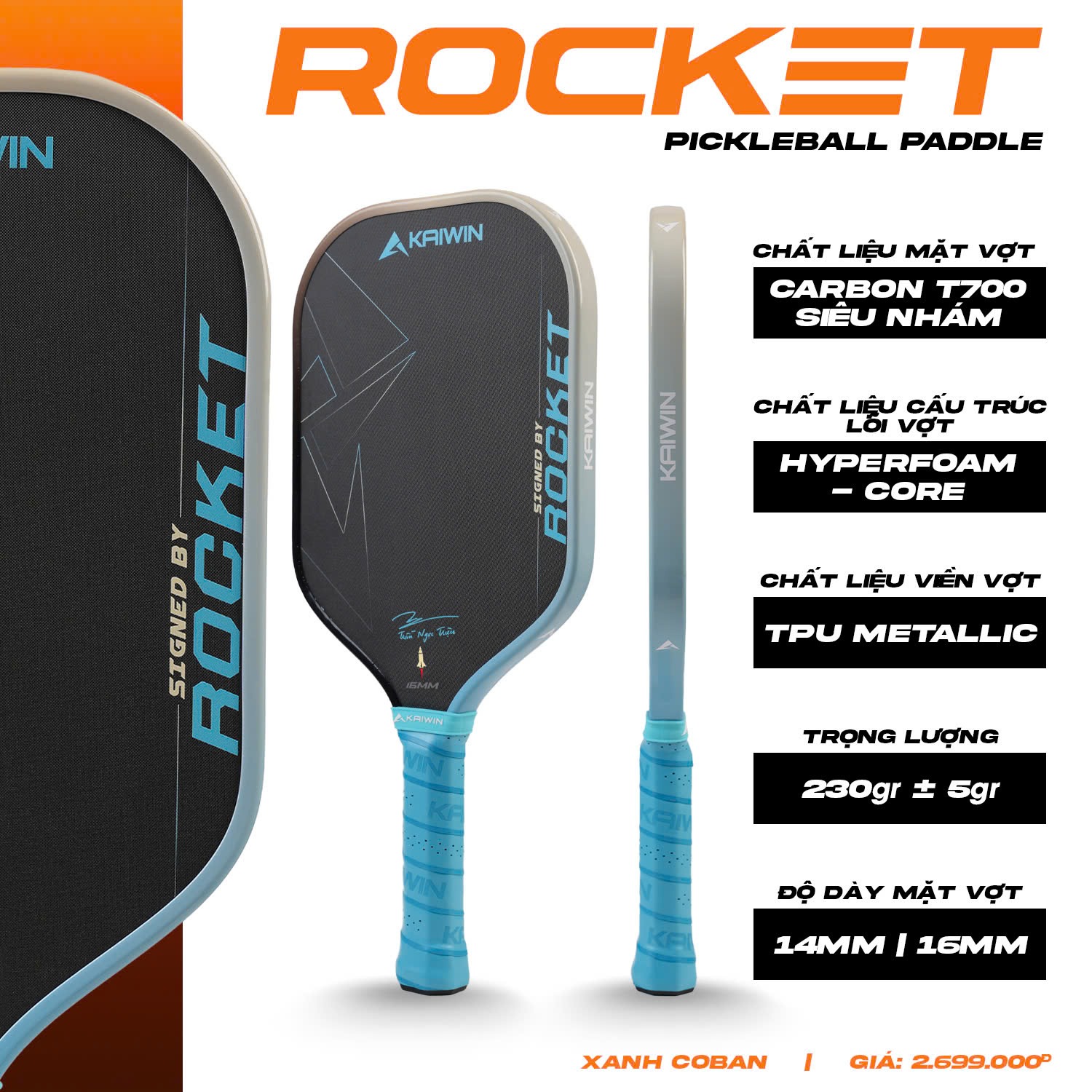– Độ dày vợt pickleball Kaiwin Rocket: 14mm & 16mm